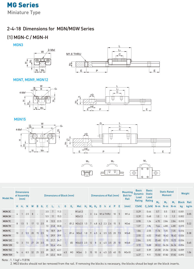 BẢNG THÔNG SỐ CON TRƯỢT VUÔNG HIWIN MGN3H, MGN7H, MGN9H, MGN12H, MGN15H