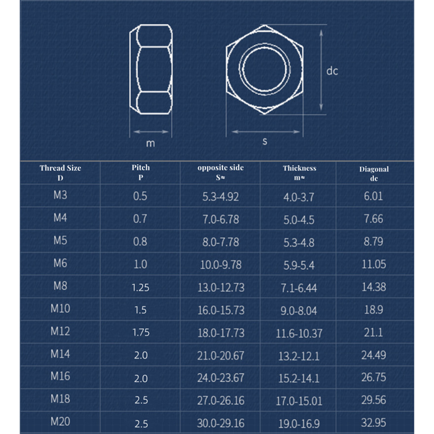 Bảng Thông Số Kỹ Thuật Đai Ốc Lục Giác Có Nắp M3 M4 M5 M6 M8 M10 M12 M14 M16 M18 M20: