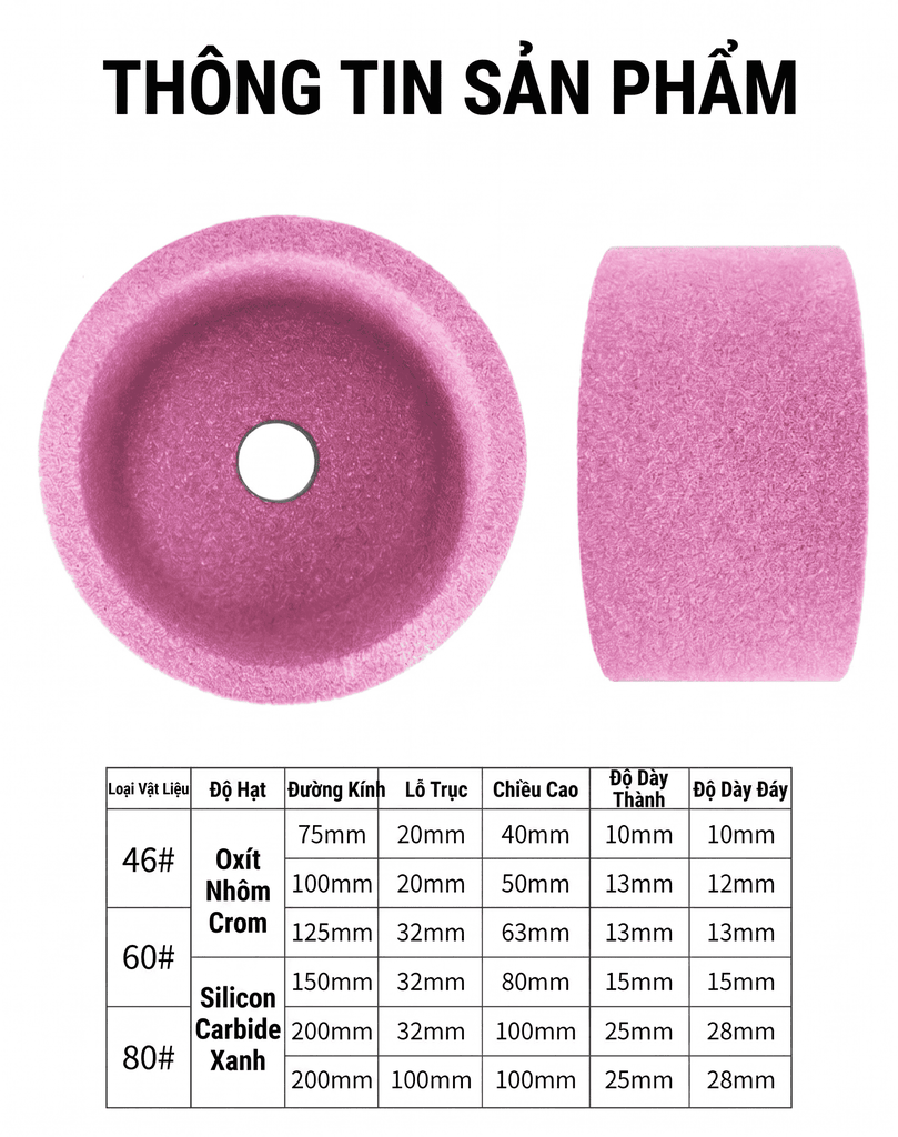 Đá mài gốm hình chén là dòng vật tư mài chuyên dụng, được thiết kế tối ưu cho các công việc mài bề mặt kim loại, làm nhẵn mối hàn và xử lý chi tiết cơ khí. Với đa dạng kích thước từ 50mm đến 250mm, sản phẩm phù hợp cho nhiều loại máy mài và nhu cầu gia công khác nhau.