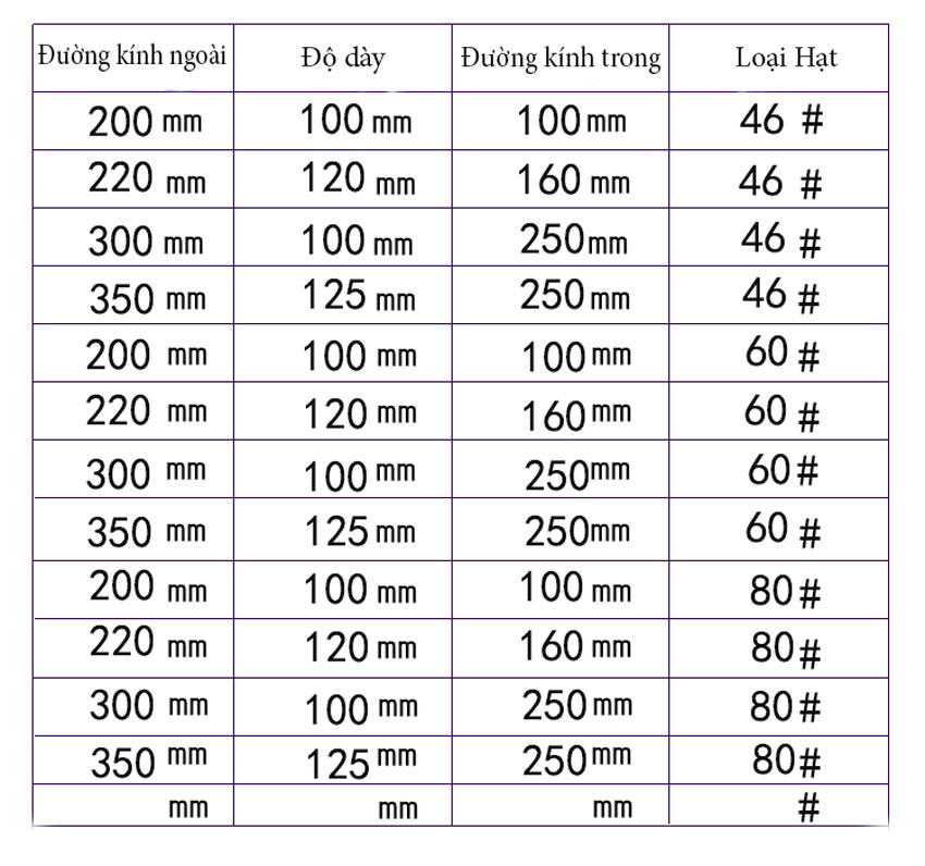 Φ200mm, Φ250mm, Φ300mm (phổ biến nhất trong ngành mài dao công nghiệp)
