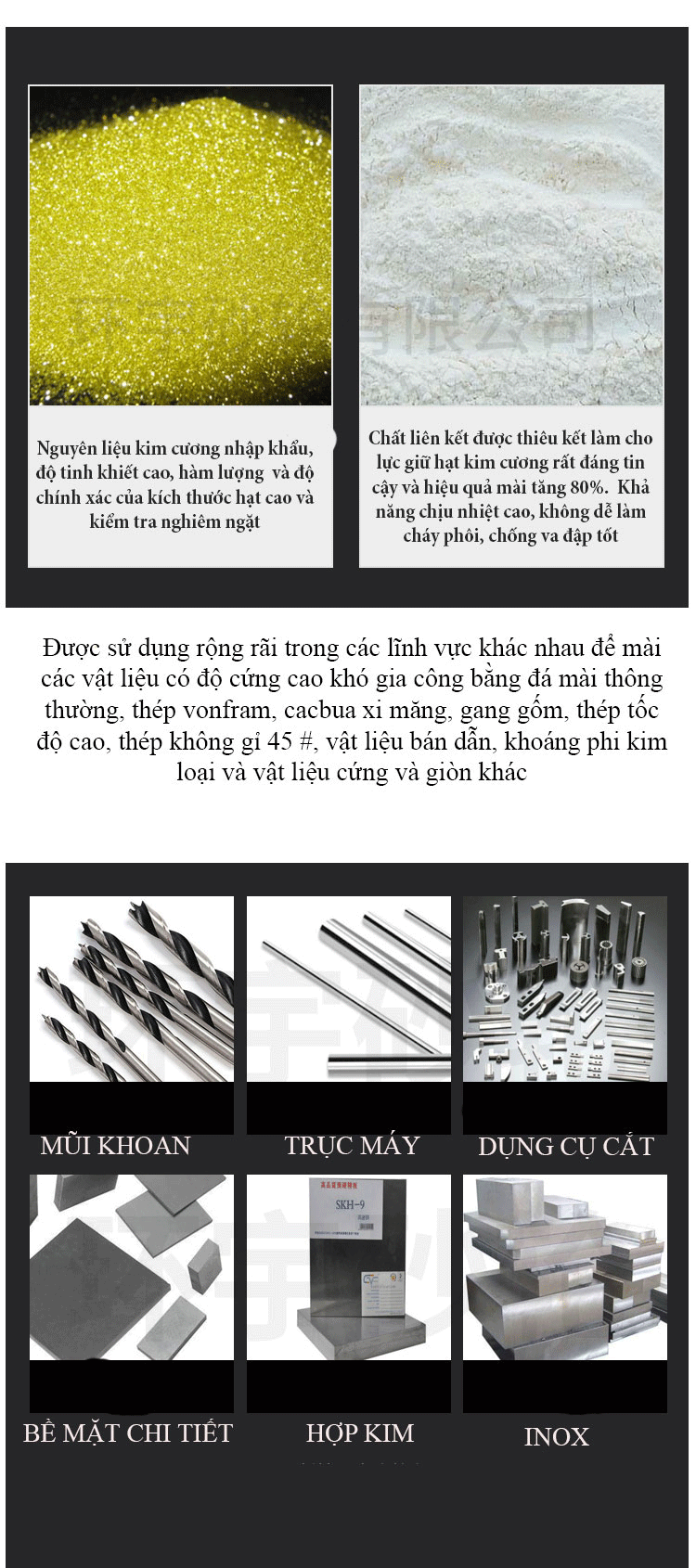 Nó có thể được sử dụng để mài và định hình các công cụ bằng thép vonfram. Bánh mài kim cương có thể duy trì hiệu suất ổn định về độ chính xác, độ mài và tuổi thọ và có thể được áp dụng để gia công nhiều vật liệu khác nhau. Nó có thể được áp dụng không chỉ cho các công cụ mài mòn, mà còn cho các công cụ chống mài mòn khác nhau