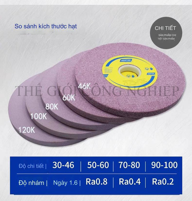 - Lỗ trục: Kích thước lỗ thường dao động từ 32 mm đến 50.8 mm, phù hợp với các loại máy mài công nghiệp.