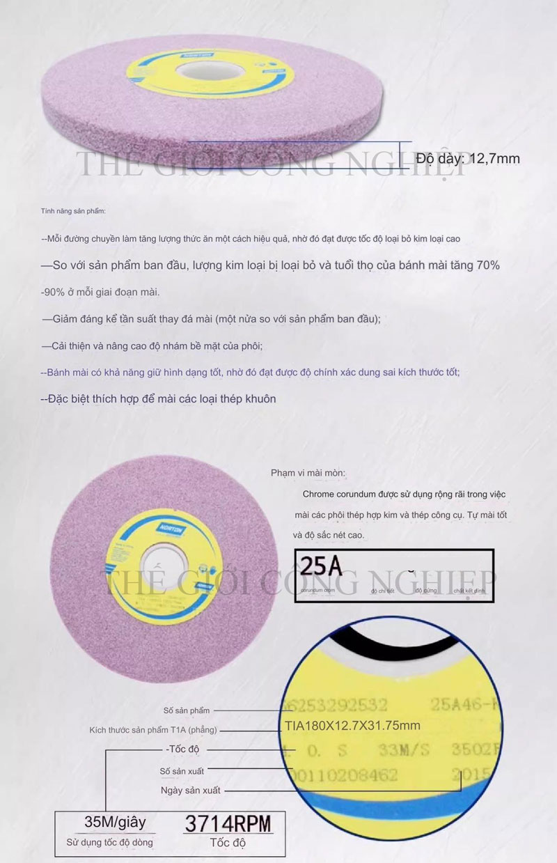 Đá mài Norton màu hồng phi 180: - Đường kính ngoài: 180 mm.