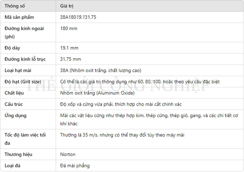 Đá mài Norton 38A18019.131.75 là một loại đá mài chất lượng cao với đường kính ngoài 180 mm, độ dày 19.1 mm và lỗ trục 31.75 mm, được thiết kế để mài các vật liệu cứng như thép hợp kim, thép gió, gang và các chi tiết cơ khí chính xác.