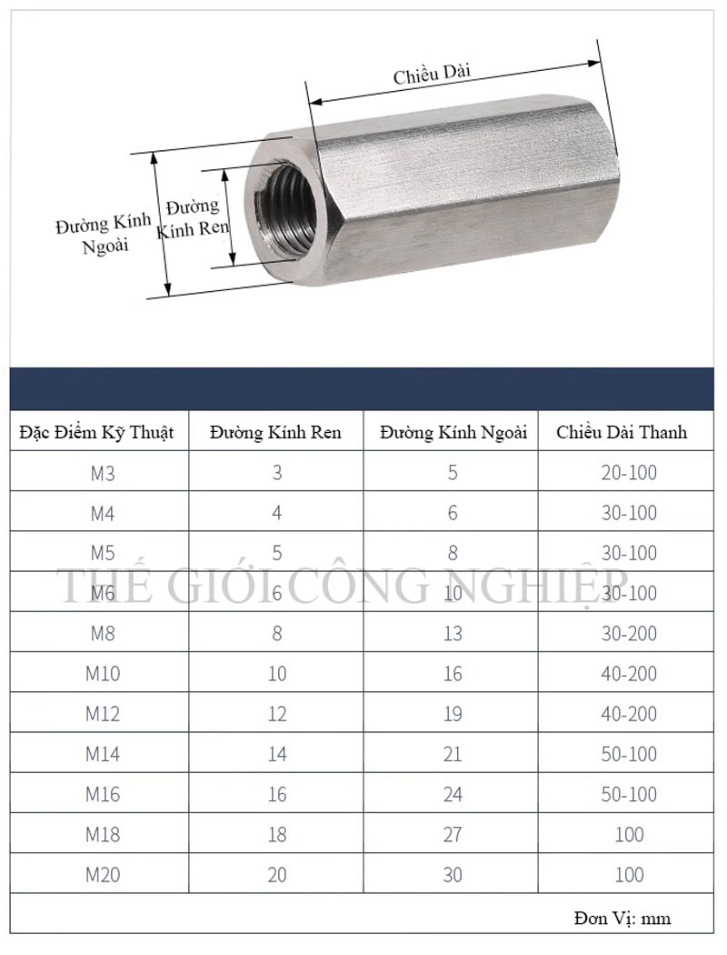 Dùng trong lắp ráp cơ khí, nối thanh ren, khung sắt, hệ thống treo, thiết bị thực phẩm hoặc các kết cấu inox cần tăng chiều dài bulong.