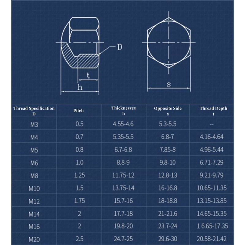 Bảng Thông Số Kỹ Thuật Đai Ốc Lục Giác Đầu Bịt m3 m4 m5 m6 m8 m10 m12 m14 m16 m20: