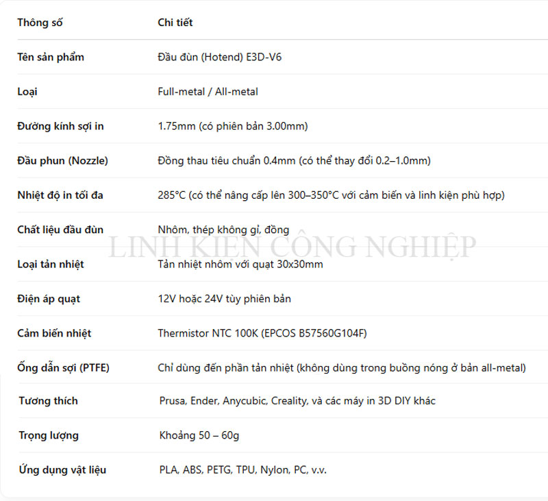 Đầu đùn E3D-V6 là một trong những dòng hotend nổi tiếng và được ưa chuộng nhất trên thị trường máy in 3D FDM nhờ khả năng in ổn định, độ chính xác cao và tương thích rộng rãi với nhiều dòng máy. Đây là phiên bản full-metal được cải tiến nhằm tăng khả năng dẫn nhiệt, hỗ trợ in các vật liệu kỹ thuật ở nhiệt độ cao và đảm bảo độ tin cậy trong quá trình in lâu dài.