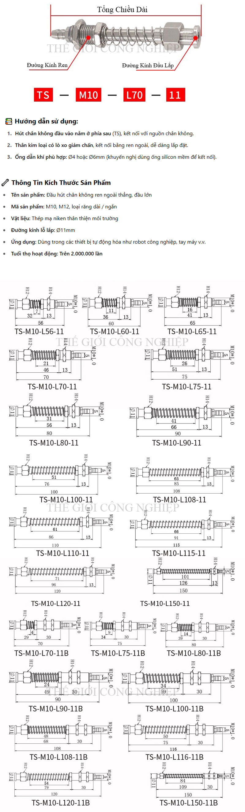 Sản phẩm gồm thân kim loại chính được gia công từ thép mạ niken chống gỉ, tích hợp lò xo giảm chấn đàn hồi và đầu nối hút chân không. Phần ren ngoài có kích thước M10 hoặc M12, tương thích với các giá đỡ tay gắp tiêu chuẩn. Đầu lắp đĩa hút loại lớn (Ø11mm) giúp kết nối chắc chắn với các đế hút chân không.