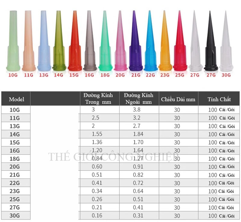 – Đường kính kim: từ 0.2mm đến 1.6mm (nhiều lựa chọn gauge).