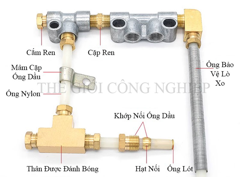 Đầu nối ống dầu – Bộ chia dầu 8*10mm dài 468mm là phụ kiện chuyên dụng trong hệ thống bôi trơn và dẫn dầu công nghiệp. Sản phẩm gồm nhiều chi tiết đi kèm như khớp nối ống nhựa nylon, ống lò xo dầu, đầu nối ren đồng, chụp bịt, ống lót và kẹp trong, giúp kết nối chắc chắn, đảm bảo khả năng phân phối dầu đồng đều và ổn định đến các vị trí cần bôi trơn.