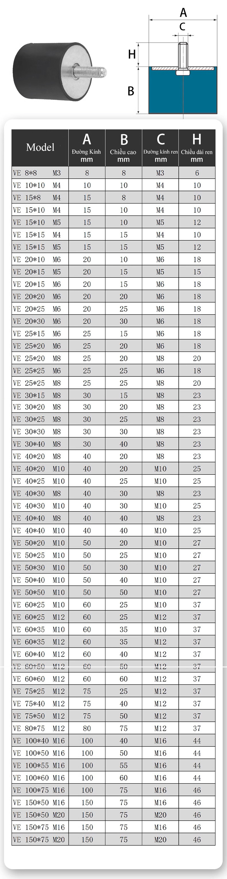 Vật liệu: Đệm cao su được làm từ cao su chất lượng cao, có khả năng chịu lực và chống mài mòn tốt, giúp giảm chấn, giảm rung động và hấp thụ sốc hiệu quả. Chân ren được làm từ thép hoặc inox, giúp đảm bảo độ bền và dễ dàng lắp đặt.