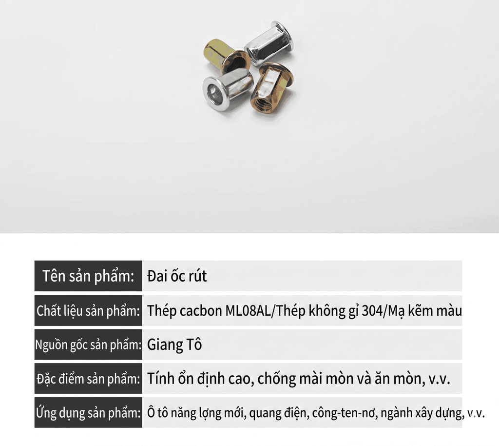 Đinh tán thép không gỉ là giải pháp liên kết cơ khí bền bỉ, được sử dụng rộng rãi trong gia công kim loại, cơ khí chế tạo, nội thất và xây dựng. Sản phẩm với đa dạng kiểu đầu như đầu phẳng có sọc, đầu chìm và đầu vít lục giác, phù hợp nhiều nhu cầu lắp ráp khác nhau, mang lại độ chắc chắn cao và tính thẩm mỹ vượt trội.