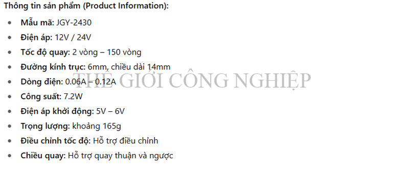 Động cơ hỗ trợ điện áp 12V hoặc 24V, dải tốc độ từ 2 – 150 vòng/phút, đáp ứng nhiều nhu cầu khác nhau từ tốc độ siêu chậm cho đến vận hành ở mức trung bình. Trục ra có đường kính 6mm, chiều dài 14mm, chế tạo bằng vật liệu chắc chắn, dễ dàng kết nối với các bánh răng, puly, khớp nối hay cơ cấu truyền động khác.