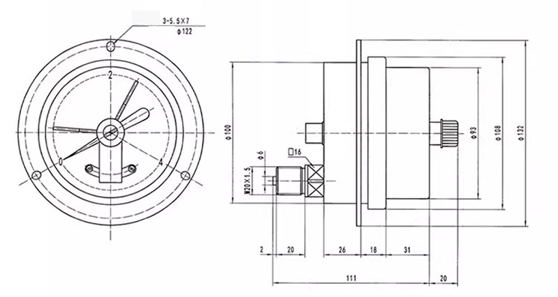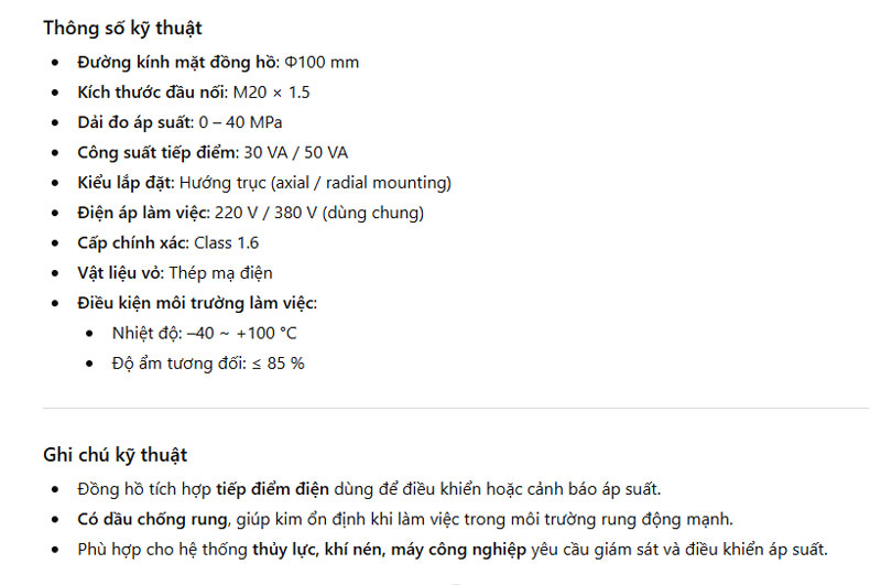 Mô tả chi tiết Đồng Hồ Áp Suất Điện Tiếp Điểm YNXC100ZT 40–60 MPa
