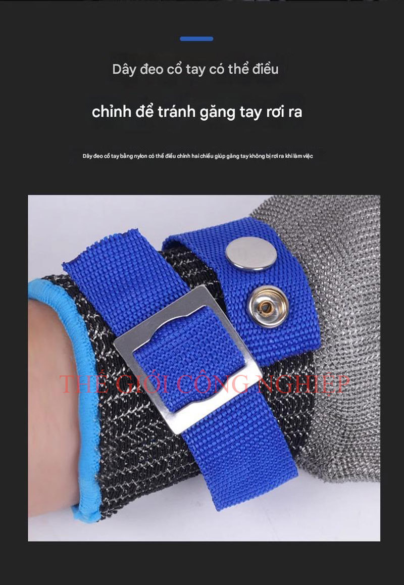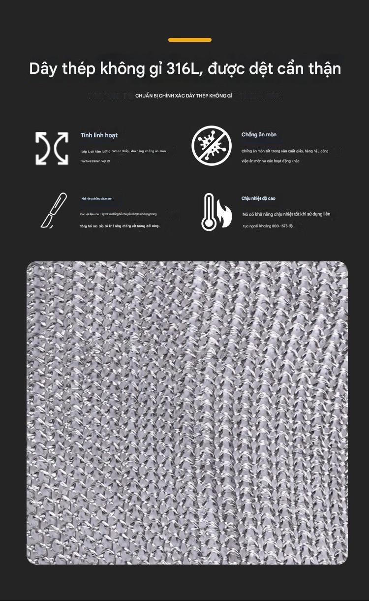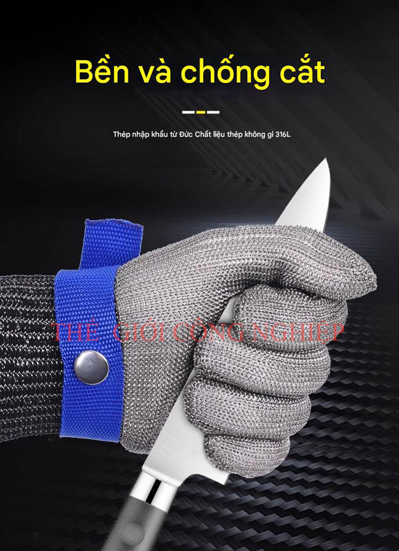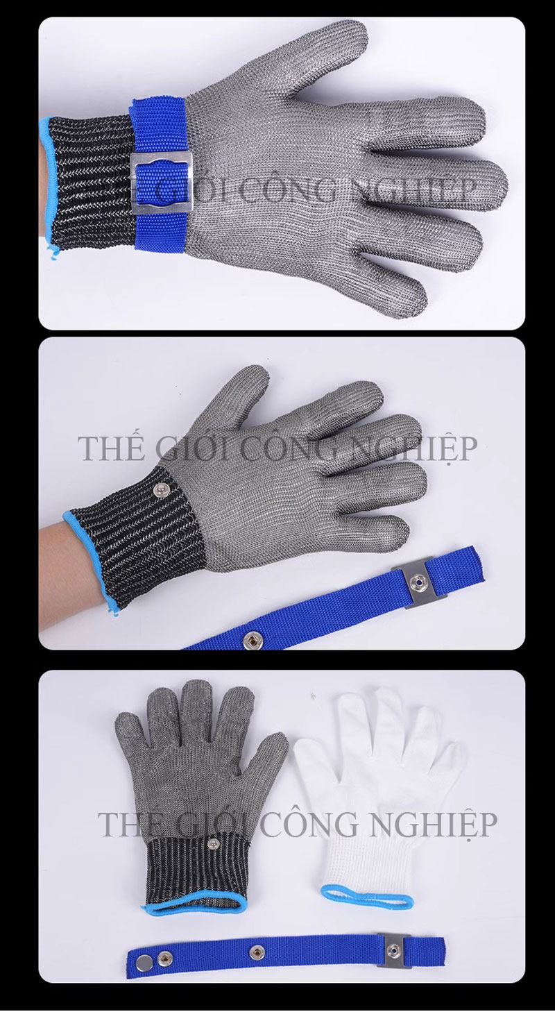- Chất liệu: Găng tay được chế tạo từ các mắt xích thép không gỉ cao cấp, thường là inox 304 hoặc inox 316, đảm bảo khả năng chống gỉ sét, ăn mòn và bền bỉ trong các môi trường khắc nghiệt. Phần dây đeo được làm từ vật liệu nhựa hoặc cao su chịu lực, có khả năng điều chỉnh linh hoạt để phù hợp với mọi kích thước bàn tay.