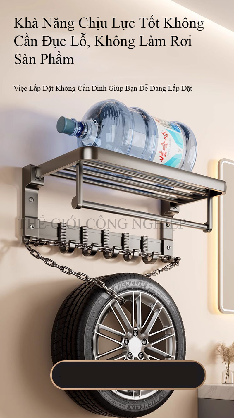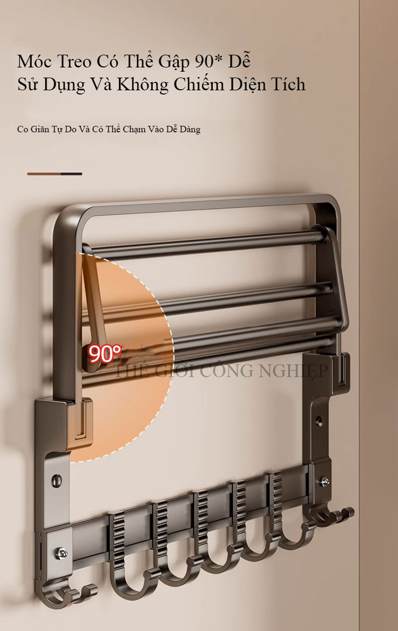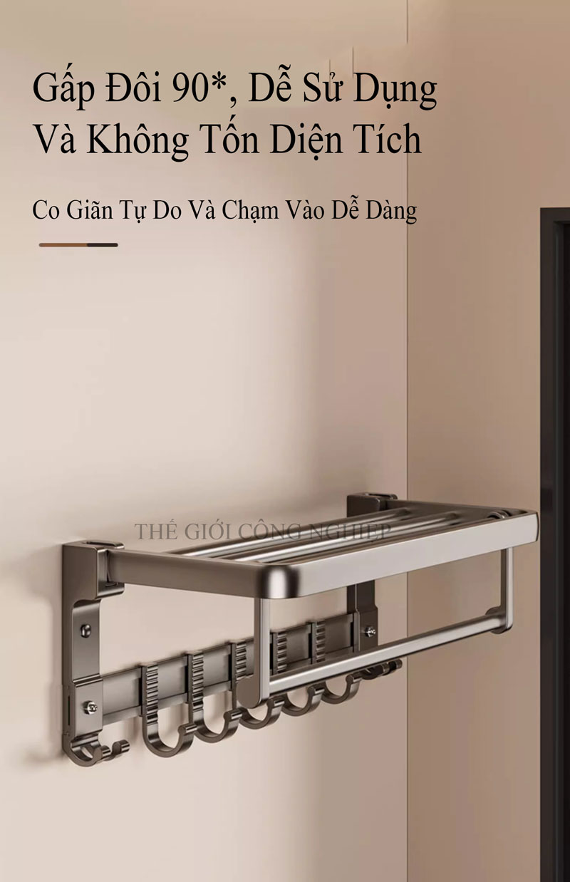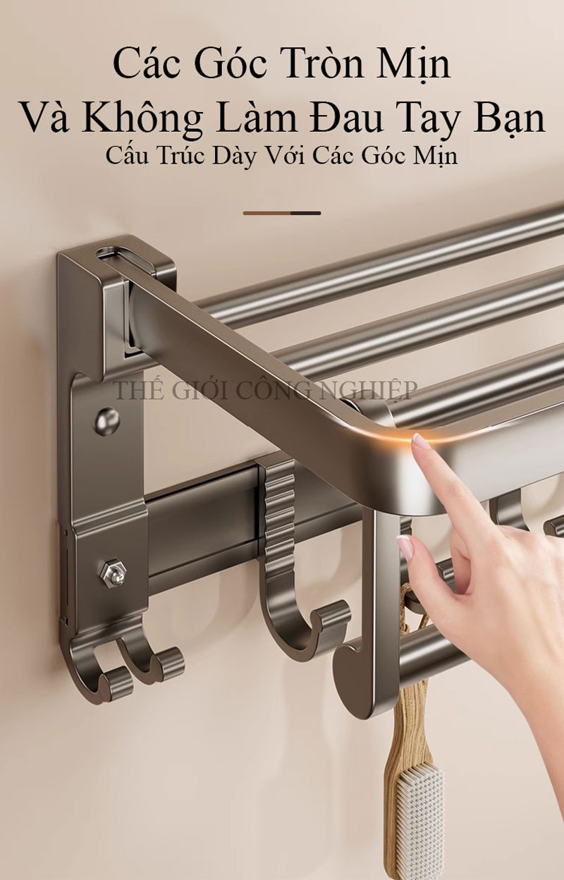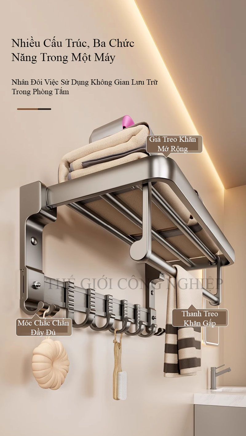 - Cấu trúc đa năng với thanh treo khăn chính, giá để đồ ở phía trên, và các móc treo phụ kiện bên dưới.