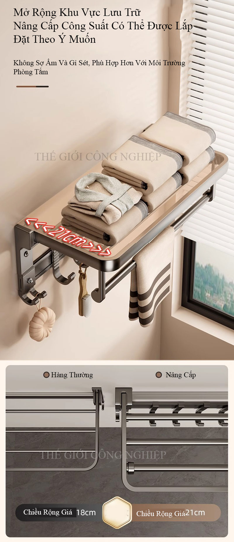 - Thiết kế hiện đại và tối ưu, tích hợp giá treo khăn và kệ để đồ trên cùng một sản phẩm, giúp tiết kiệm không gian và tăng tính tiện ích.