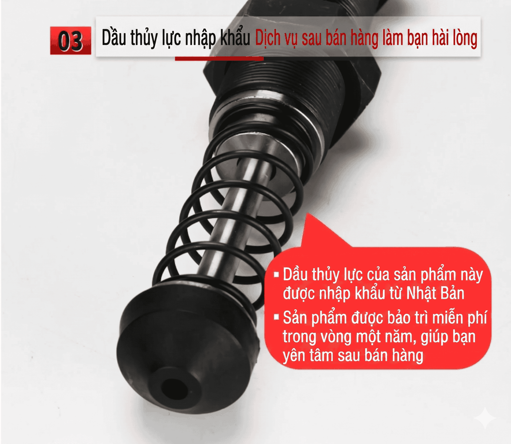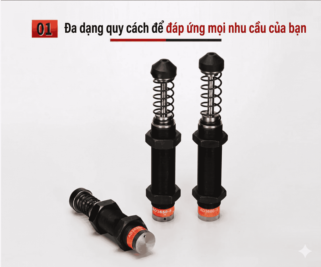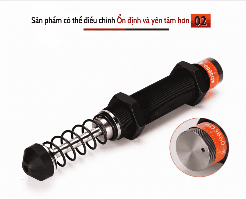 Nhờ cơ chế hấp thụ năng lượng bằng dầu thủy lực, thiết bị có khả năng triệt tiêu xung lực nhanh chóng, giảm thiểu rung động và tiếng ồn – yếu tố quan trọng trong các hệ thống yêu cầu độ chính xác cao.