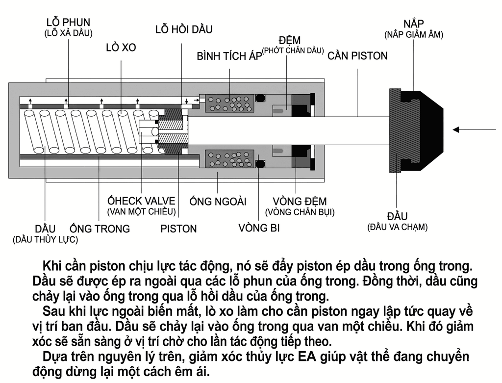 Khi có lực tác động, piston bị đẩy vào trong, dầu thủy lực bên trong buồng sẽ bị nén và di chuyển qua các khe hẹp. Quá trình này tạo ra lực cản giúp hấp thụ năng lượng va đập và làm chậm chuyển động một cách êm ái, tránh sốc cơ học.