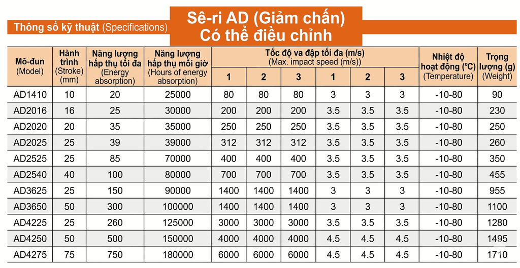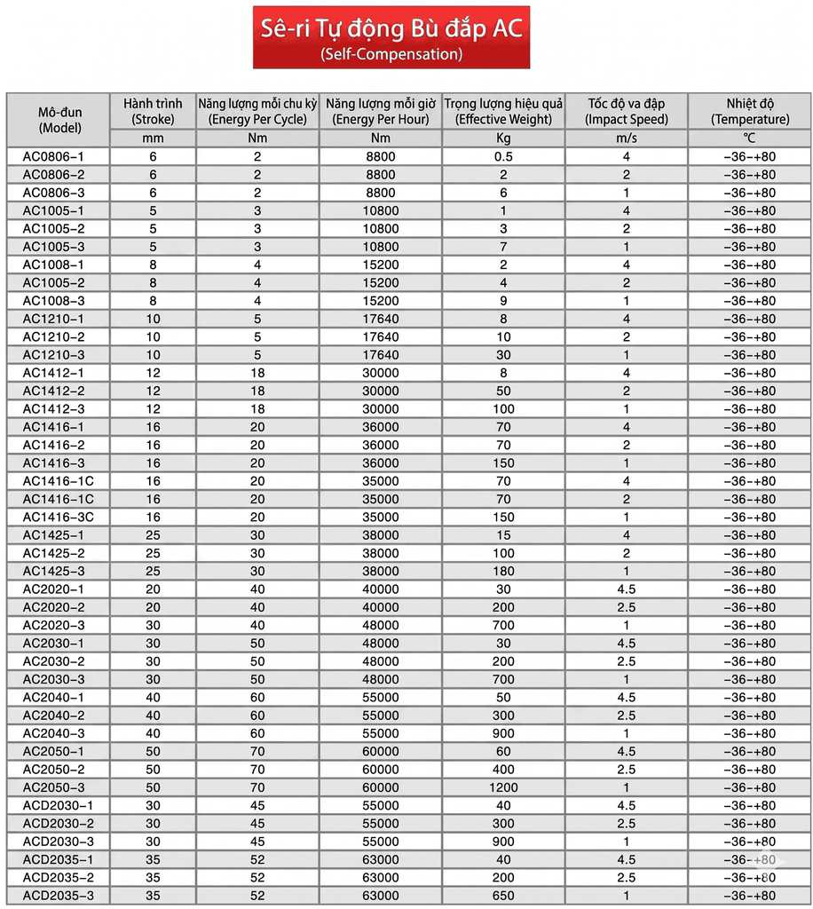 Bộ giảm chấn dầu thủy lực AC1416, AC0806, AC1007 là dòng phụ kiện kỹ thuật chuyên dụng trong lĩnh vực tự động hóa công nghiệp. Sản phẩm được thiết kế nhằm kiểm soát lực va đập ở cuối hành trình, giúp cánh tay robot và các cơ cấu chuyển động vận hành mượt mà, ổn định và an toàn hơn.