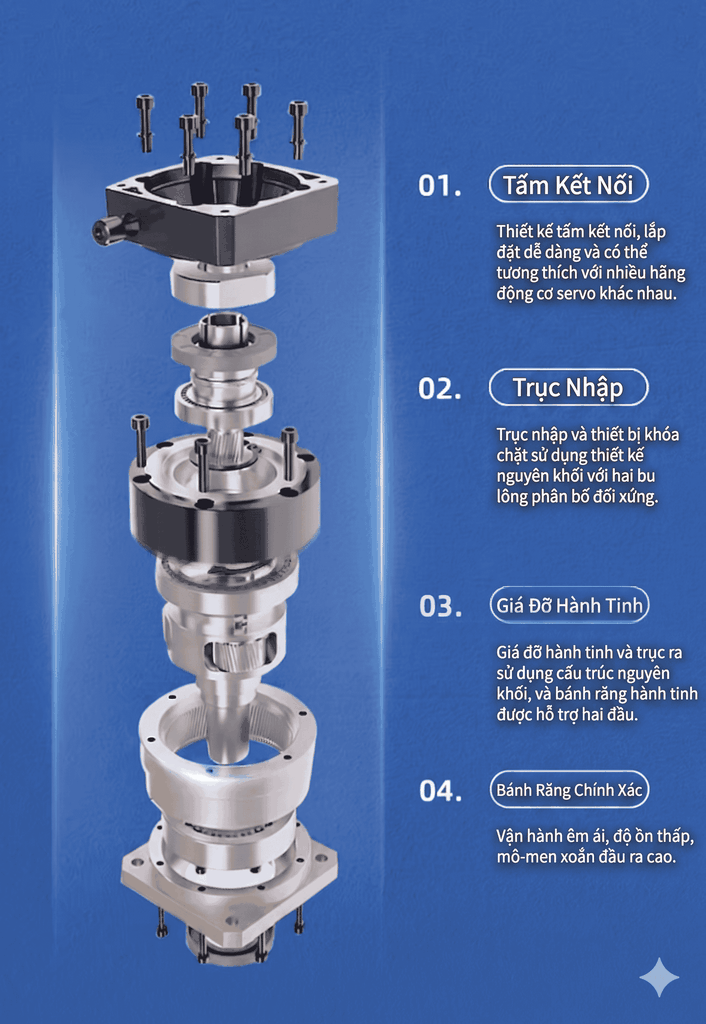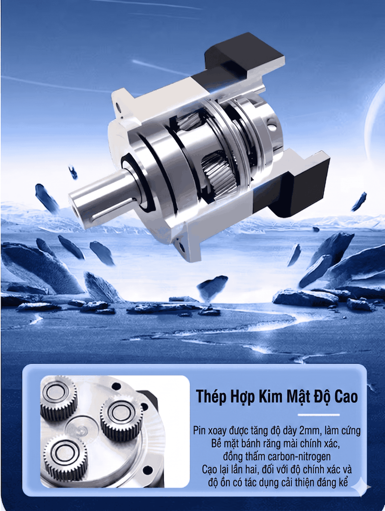 Hộp giảm tốc hành tinh xoắn ốc chính xác là giải pháp truyền động cao cấp, được thiết kế tối ưu cho các hệ thống sử dụng động cơ servo yêu cầu độ chính xác cao, vận hành êm ái và độ bền vượt trội. Với độ rơ cực thấp chỉ từ 1–3 arcmin, sản phẩm giúp đảm bảo độ chính xác vị trí, tăng hiệu suất làm việc và kéo dài tuổi thọ thiết bị.