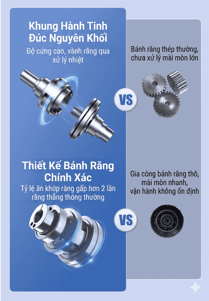 Cấu trúc bánh răng xoắn ốc: Tăng khả năng truyền tải, giảm tiếng ồn, vận hành mượt mà.