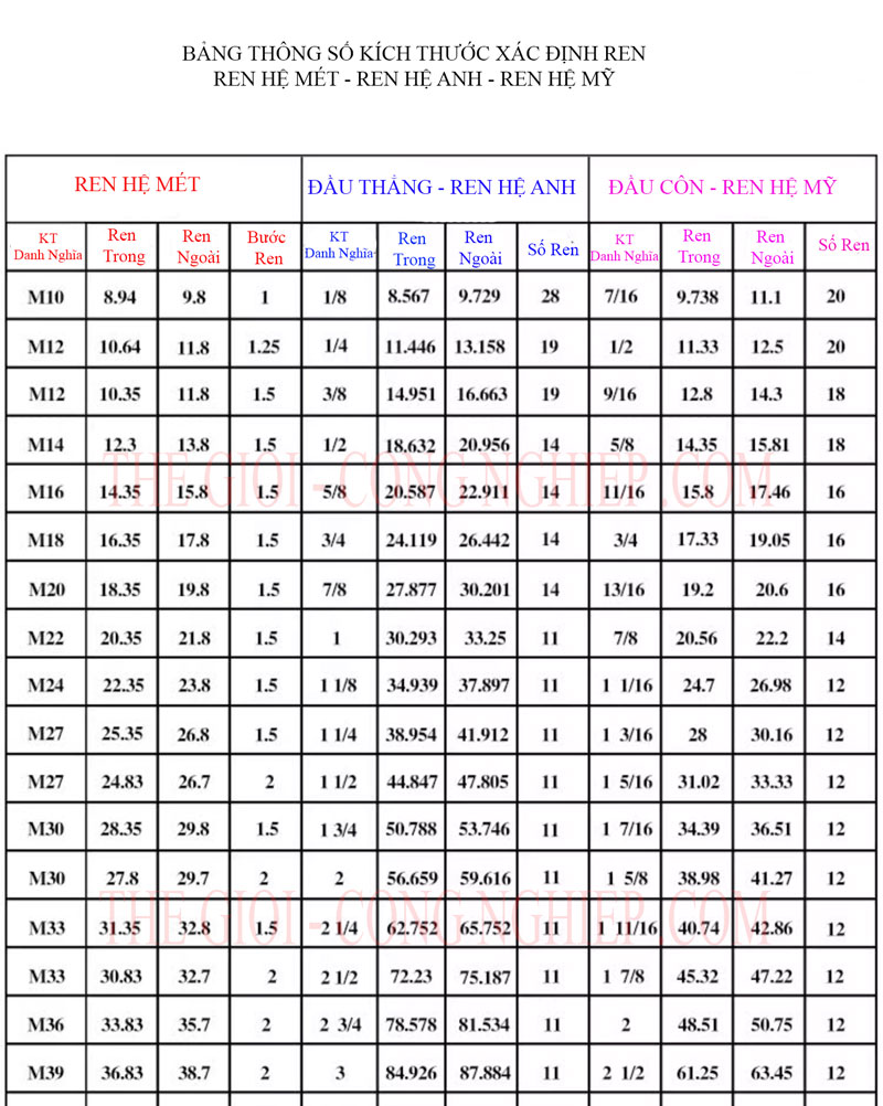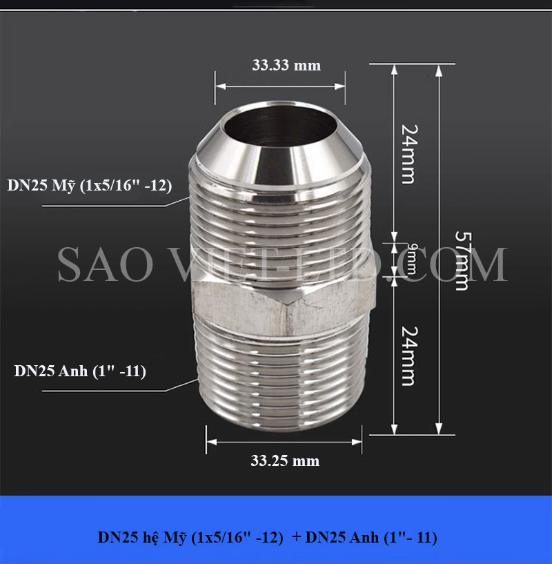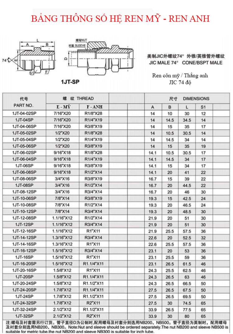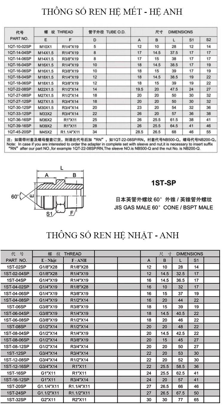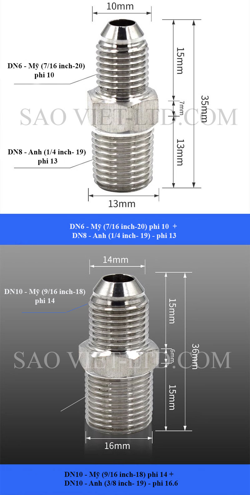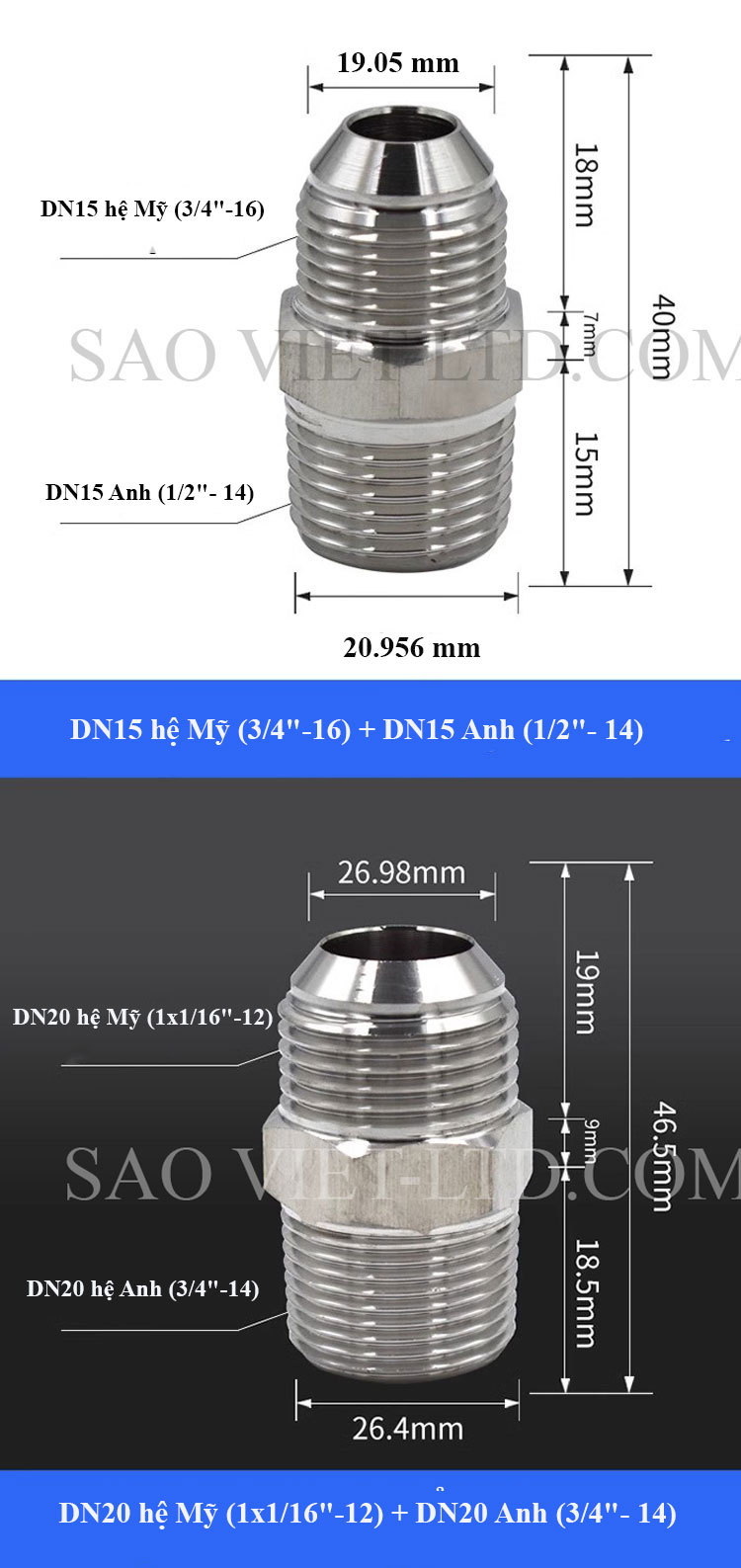 Kép côn ren ngoài: Đầu côn hệ ren Mỹ / Đầu thẳng hệ Anh