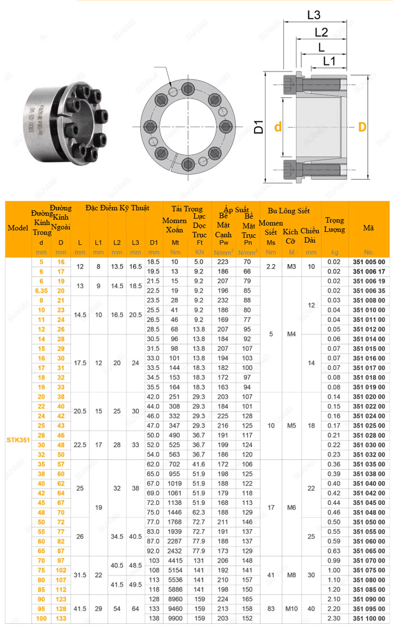 Khóa khớp trục không then STK351 là chi tiết dùng để ghép chặt trục với chi tiết lắp ghép (như puly, bánh răng, hub/coupling…) mà không cần rãnh then truyền thống. Sản phẩm hoạt động bằng lực siết ốc tập trung tạo áp lực ép đồng tâm – lực ma sát cao, giúp truyền mô-men hiệu quả và dễ dàng tháo/lắp.