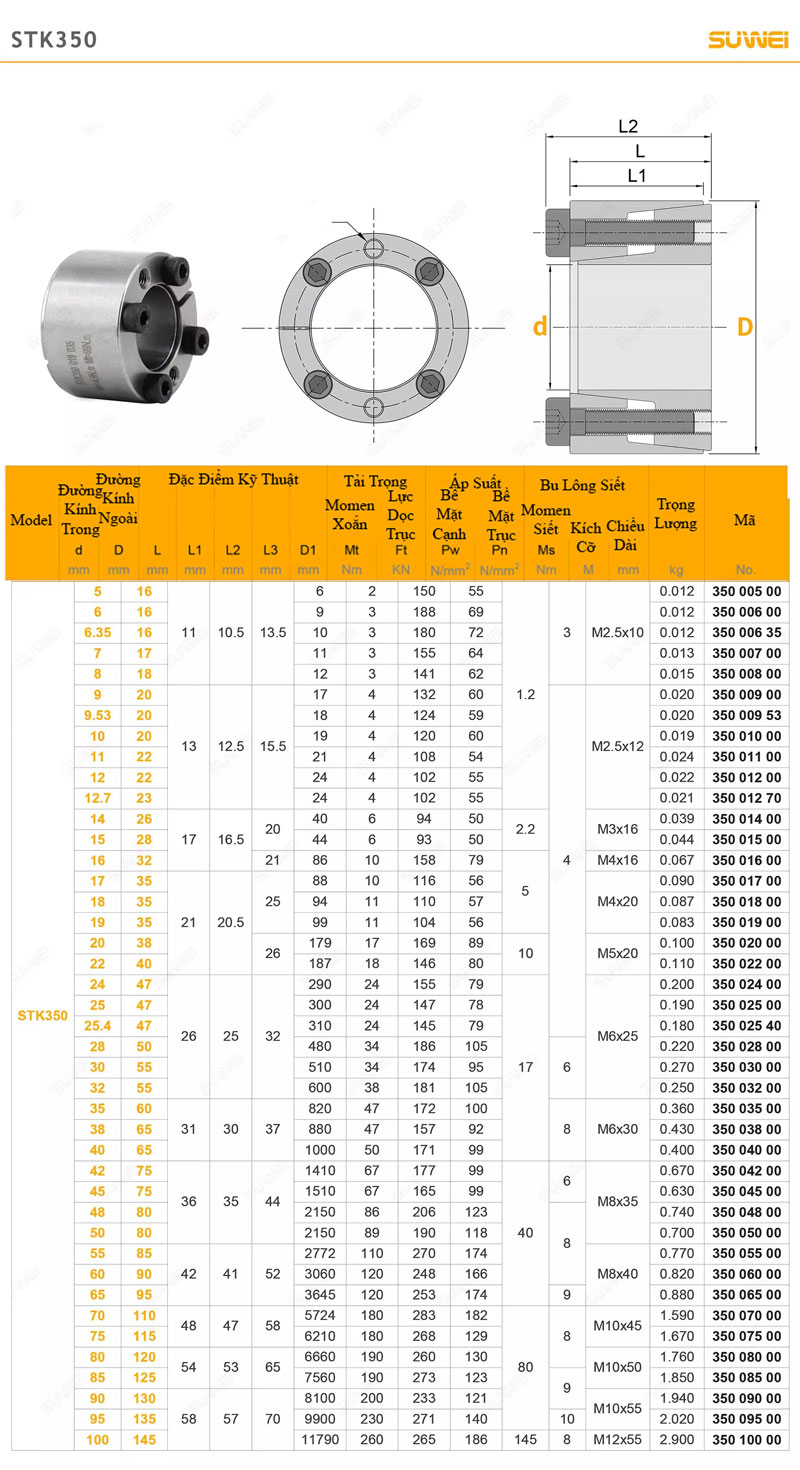 STK350 là thiết bị khóa trục không then (Keyless Locking Device) dùng để liên kết chặt giữa trục và bộ phận lắp ghép như bánh răng, puly, đĩa xích, khớp nối… mà không cần gia công rãnh then. Thiết bị truyền mô-men xoắn bằng lực ma sát nén, tạo kết nối cứng vững, đồng tâm cao và không có độ rơ.