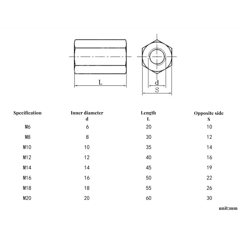 Bảng Thông Số Kỹ Thuật Khớp Nối Đai Ốc Lục Giác M6 M8 M10 M12 M14 M16 M18 M20: