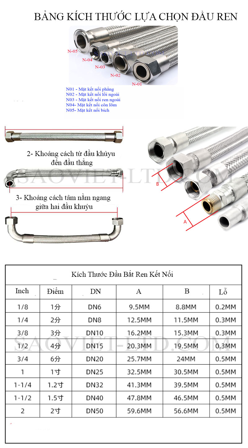 Làm bằng inox, kiểu ren ngoài hoặc ren trong, theo tiêu chuẩn BSPT, NPT hoặc G. Phổ biến với dạng ren ngoài hai đầu hoặc một đầu ren – một đầu hàn.