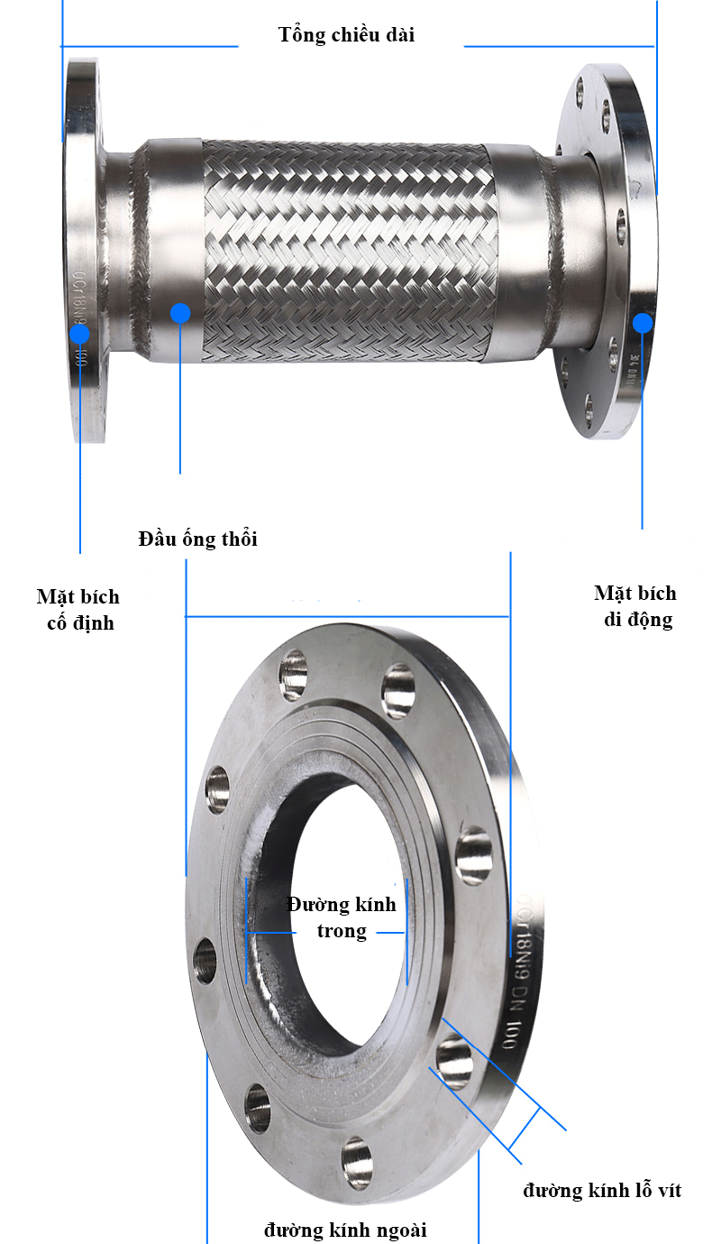 Mặt bích tiêu chuẩn (JIS, ANSI, DIN, BS...), hàn liền với đầu ống mềm, giúp kết nối chặt với hệ thống ống hoặc thiết bị khác. Mặt bích thường làm bằng inox hoặc thép mạ kẽm.
