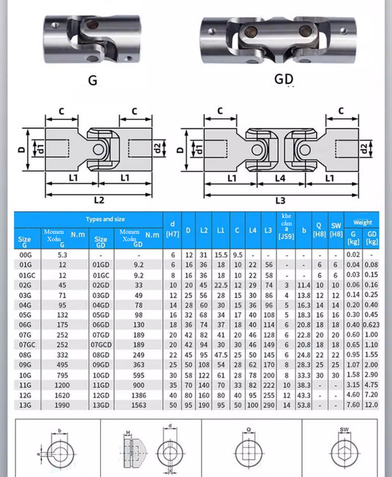 Cấu tạo gồm hai đầu nối trục và phần khớp trung gian dạng chữ thập (cardan), cho phép chuyển động linh hoạt giữa hai trục. Các đầu kết nối có thể là dạng lỗ trơn, lỗ ren hoặc kẹp trục, giúp lắp đặt dễ dàng và tương thích với nhiều loại trục khác nhau. Thiết kế gia công chính xác giúp giảm ma sát, hạn chế mài mòn và đảm bảo truyền động mượt mà.