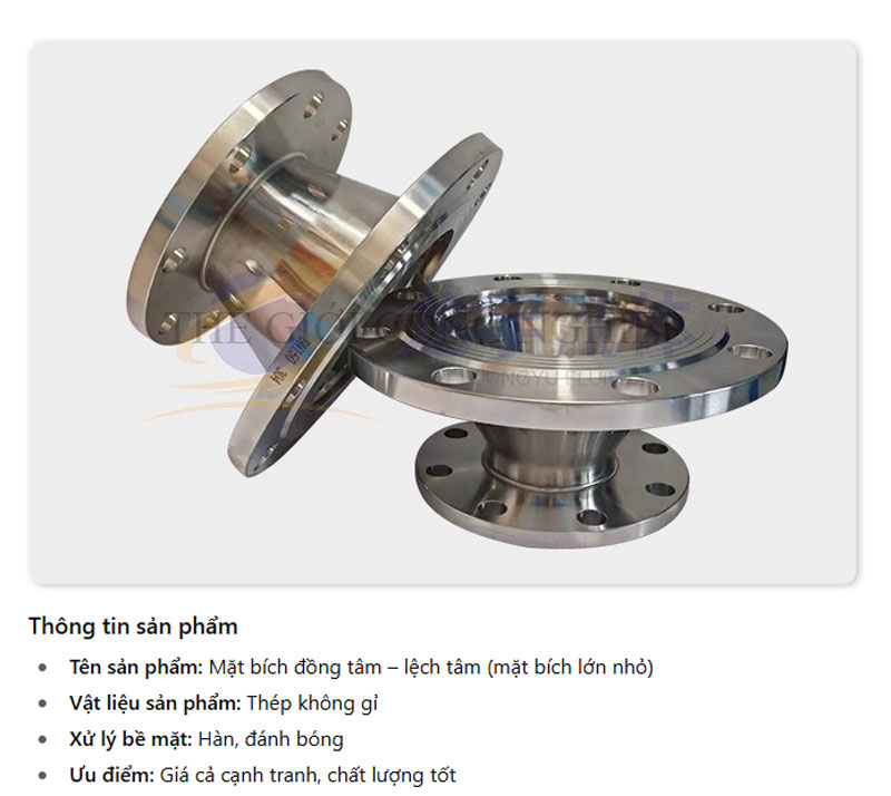 Mặt bích đồng tâm – lệch tâm inox 304/316L, nối hàn, biến theo tiêu chuẩn vệ sinh là phụ kiện đường ống quan trọng trong các hệ thống dẫn truyền chất lỏng, khí và hơi, đặc biệt trong các ngành công nghiệp yêu cầu độ sạch, độ an toàn và độ bền cao. Sản phẩm được gia công từ thép không gỉ 304 hoặc 316L chất lượng cao, đáp ứng các tiêu chuẩn quốc tế về cơ tính, hóa tính và vệ sinh công nghiệp. Inox 304 nổi bật với khả năng chống gỉ và độ bền cơ học tốt, trong khi inox 316L có thêm hàm lượng molypden giúp tăng khả năng kháng ăn mòn trong môi trường hóa chất, nước muối và axit nhẹ.