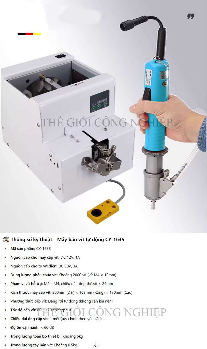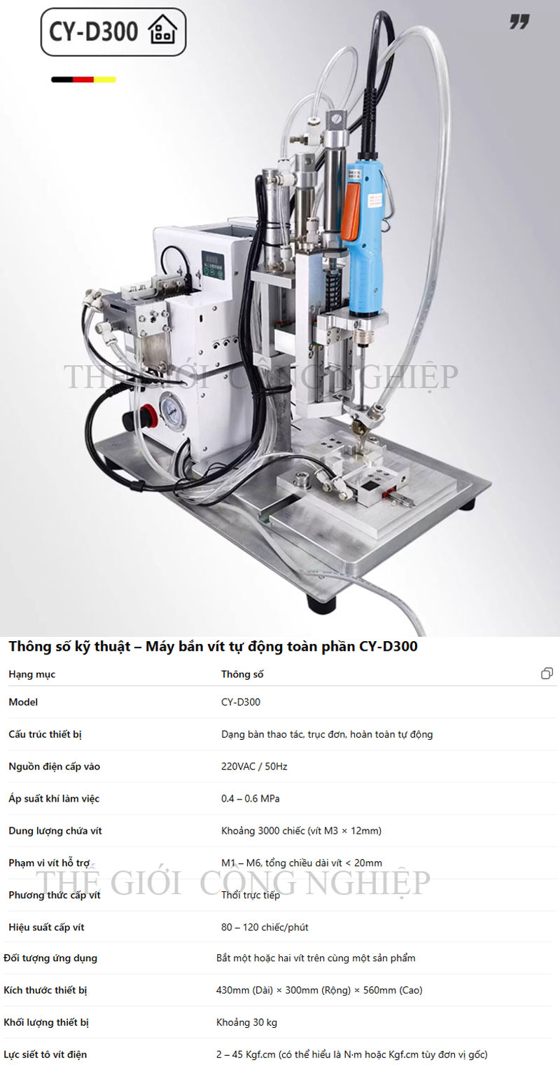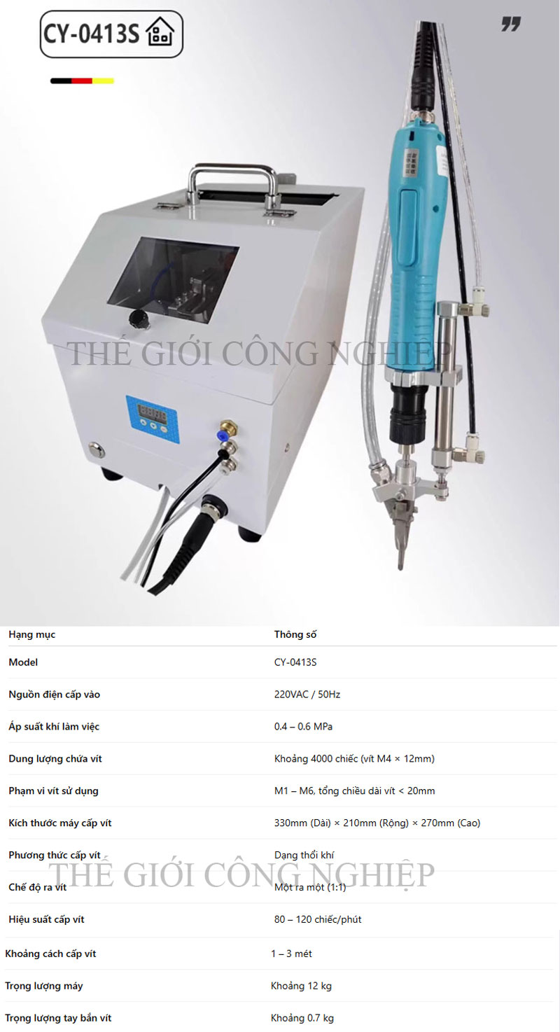 Máy bắn vít tự động toàn phần là thiết bị chuyên dụng trong dây chuyền lắp ráp công nghiệp, tích hợp chức năng cấp vít, định vị và siết vít hoàn toàn tự động. Với cơ chế cấp vít dạng thổi khí tốc độ cao hoặc rơi tự động không cần khí nén, máy giúp tối ưu hóa hiệu suất làm việc, giảm thời gian thao tác thủ công và nâng cao độ chính xác trong quá trình lắp ráp.