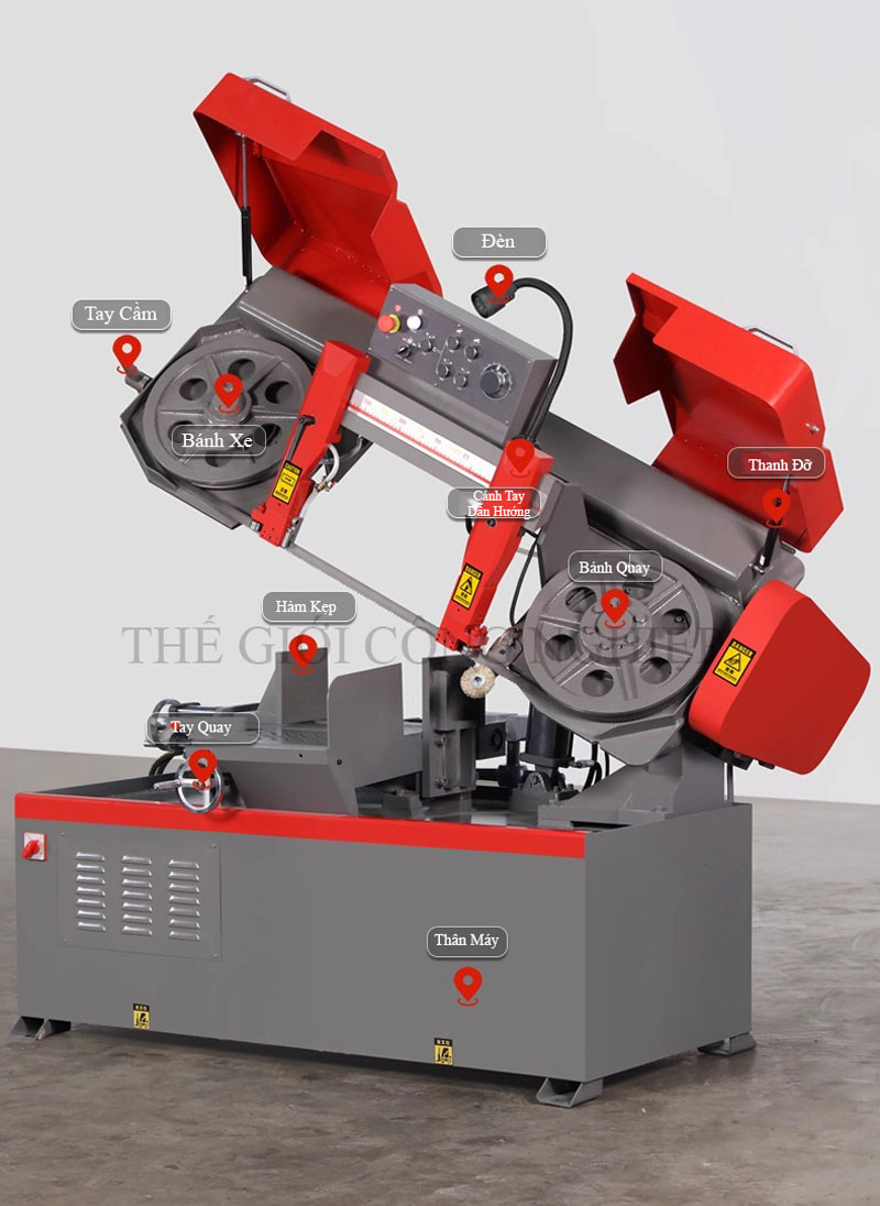 Máy còn được trang bị cơ cấu kẹp thủy lực chắc chắn, đảm bảo phôi luôn cố định trong quá trình cắt, hạn chế rung lắc và sai lệch. Hệ thống bôi trơn và làm mát tự động giúp duy trì nhiệt độ ổn định cho lưỡi cưa, kéo dài tuổi thọ thiết bị và giảm chi phí bảo trì. Ngoài ra, khung máy được chế tạo bằng thép cứng vững, khả năng chịu tải trọng lớn, hoạt động ổn định ngay cả trong môi trường công nghiệp nặng.