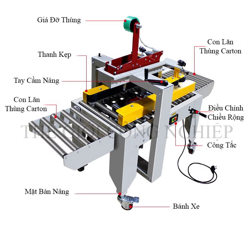 Toàn bộ thân máy được làm bằng thép sơn tĩnh điện hoặc inox, độ bền cao, dễ điều chỉnh chiều rộng và chiều cao để phù hợp với nhiều kích thước thùng khác nhau. -