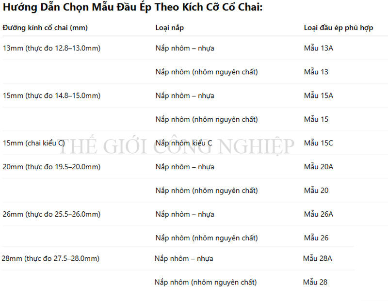 Tùy chọn đầu dập theo cỡ cổ chai, thay đổi nhanh chóng