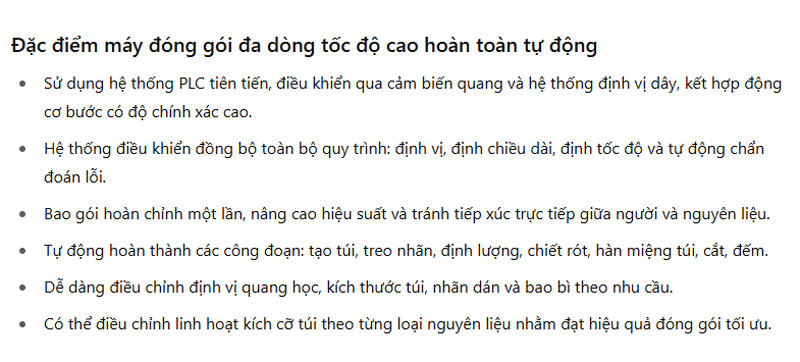 Tự động hoàn tất quy trình: gồm định lượng, tạo túi, chiết liệu, hàn mép, cắt túi, in date (tùy chọn).