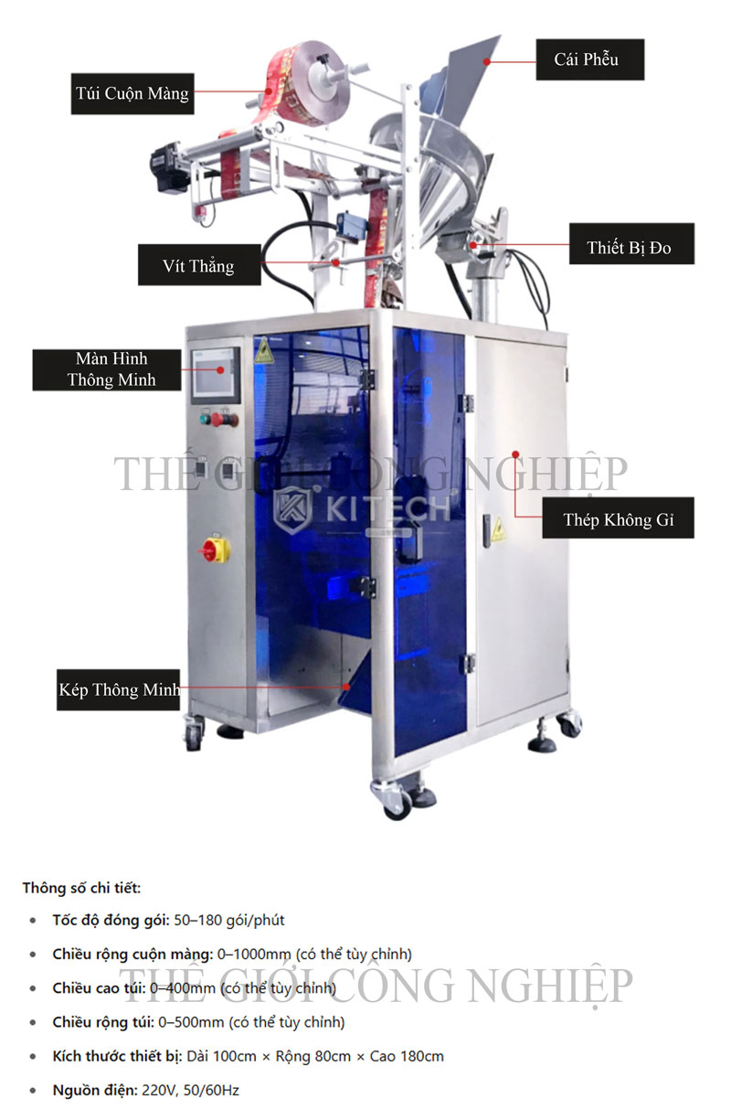 Máy Đóng Gói Cà Phê Bột Tự Động là thiết bị chuyên dụng để đóng gói các loại bột mịn như cà phê hòa tan, bột matcha, bột ngũ cốc, bột collagen… thành dạng gói thanh tiện lợi, với đường hàn lưng và góc túi bo tròn thẩm mỹ. Máy ứng dụng công nghệ định lượng trục vít chính xác và hệ thống tạo túi, chiết rót, hàn mép hoàn toàn tự động, phù hợp cho các nhà máy thực phẩm, OEM cà phê và đồ uống dinh dưỡng.