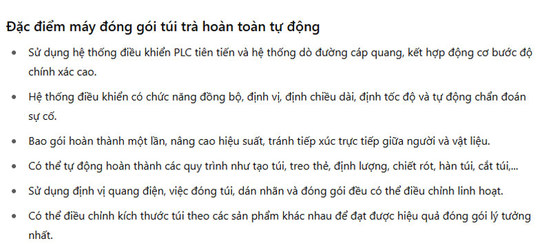 Tự động hoàn thiện các bước: Gồm định lượng – tạo túi – chiết rót – hàn túi – cắt túi – dán nhãn – đóng túi ngoài.