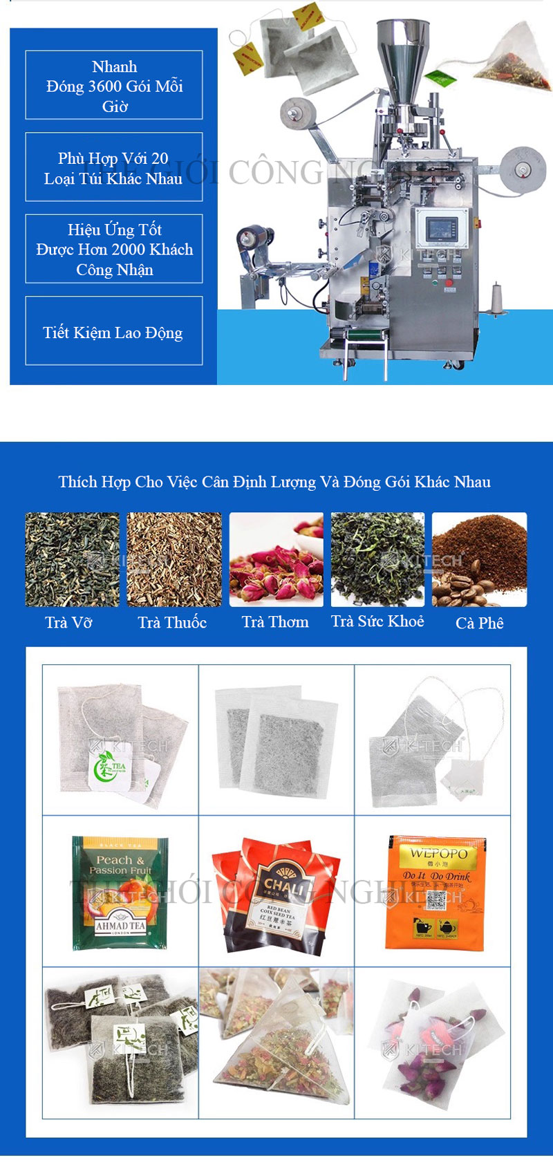 Máy Đóng Gói Trà Tự Động Đa Đầu là thiết bị chuyên dụng để đóng gói các loại trà lá, thảo dược, hoa khô, trái cây sấy… vào túi lọc tam giác bằng nylon hoặc vải không dệt, tích hợp đóng gói túi trong và túi ngoài tự động. Máy sử dụng hệ thống định lượng đa đầu chính xác cao, đảm bảo trọng lượng đồng đều và hiệu quả đóng gói tối ưu.
