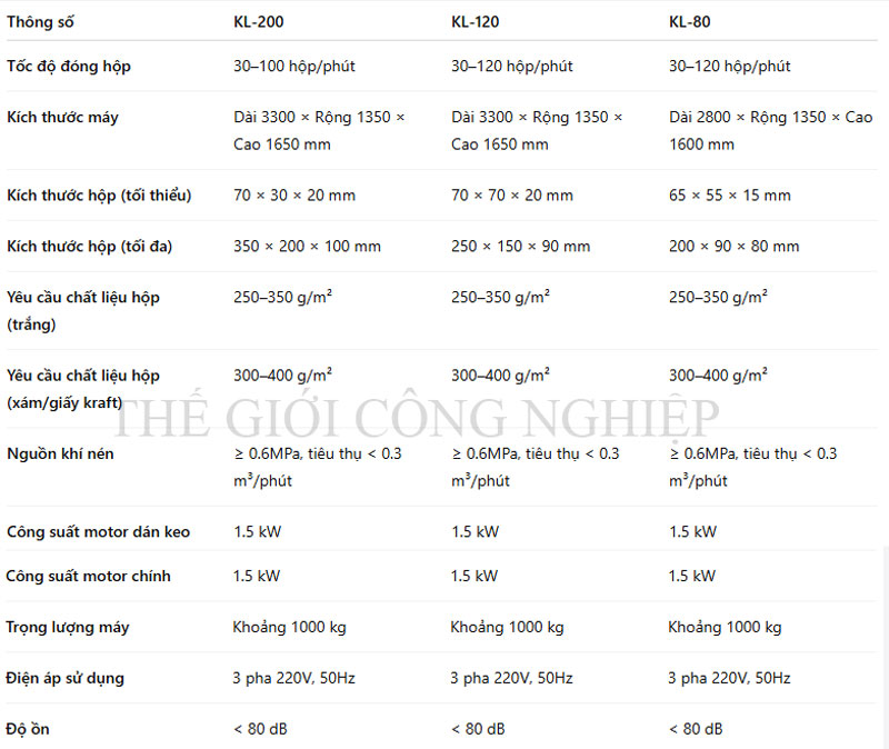 5. Thông số kỹ thuật tiêu chuẩn (tham khảo model KL-120):