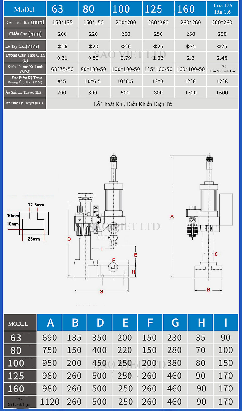 Xi lanh khí nén: Sử dụng xy lanh đôi hoặc đơn, hành trình ổn định, sinh lực ép nhanh và đều.