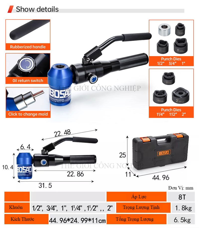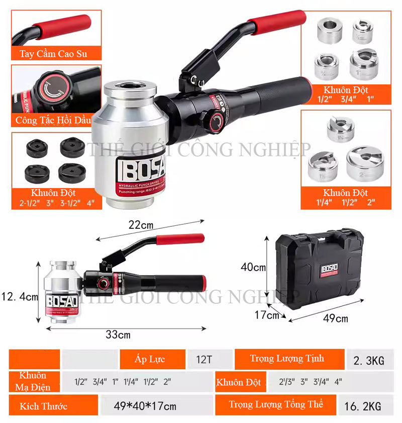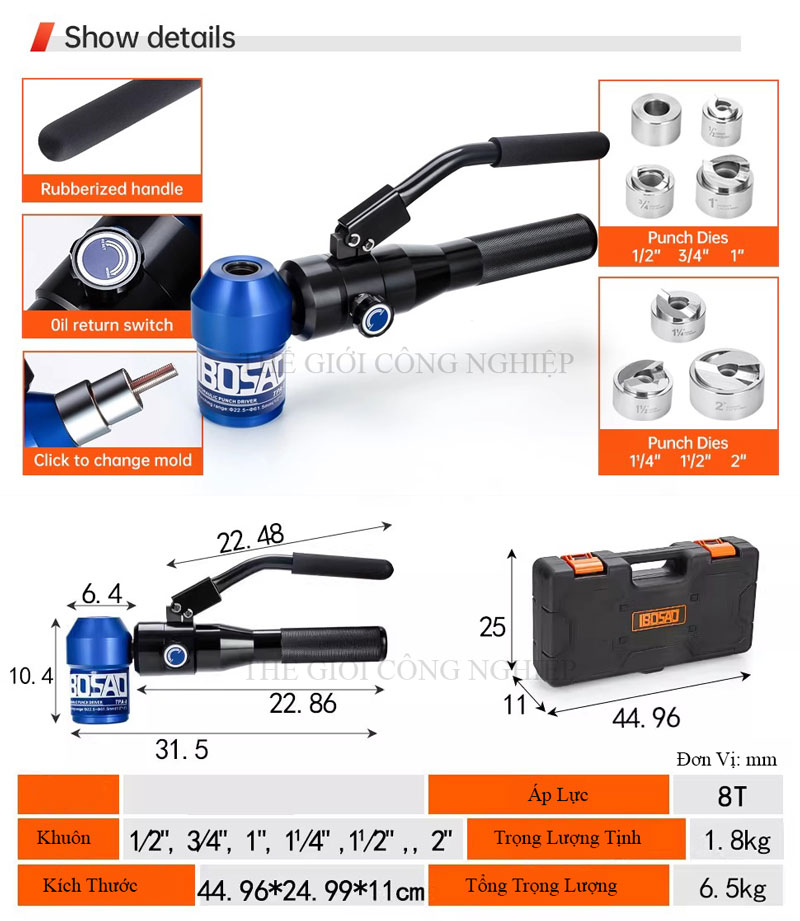 IBOSAD TPA-8 là máy đột lỗ thủy lực cầm tay, thiết kế nhỏ gọn, chuyên dùng để đột lỗ tròn trên các vật liệu như thép, inox, nhôm và nhựa. Với lực ép mạnh mẽ và khả năng xoay đầu 360°, thiết bị này phù hợp cho các công việc trong ngành điện, cơ khí, tủ điện và hệ thống ống dẫn.