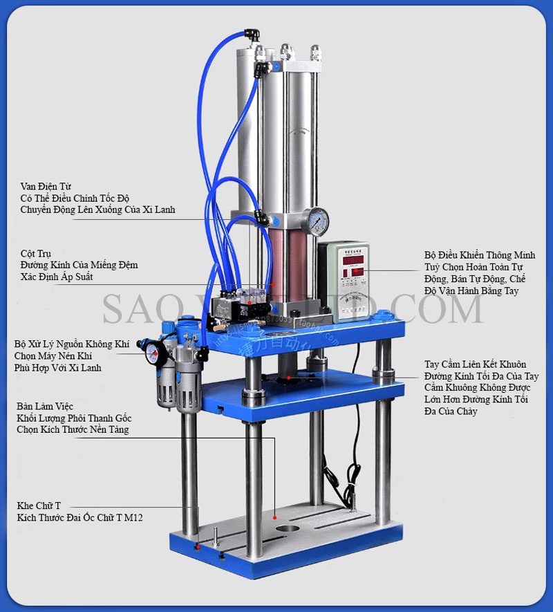 - Xi lanh tăng áp: Máy được trang bị xi lanh khí nén với bộ tăng áp, giúp cung cấp lực đẩy mạnh mẽ và ổn định trong quá trình gia công. Xi lanh tăng áp giúp máy đạt được áp suất lớn mà không cần sử dụng nhiều năng lượng, phù hợp cho các công việc đòi hỏi áp lực cao.