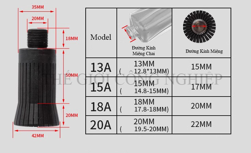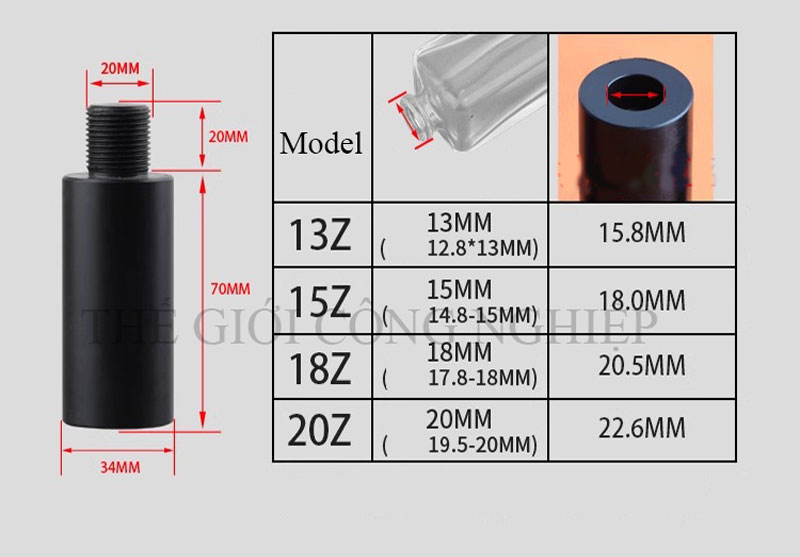 Có thể thay đổi kích cỡ đầu kẹp tương thích với các loại nắp: 13mm, 15mm, 18mm, 20mm.