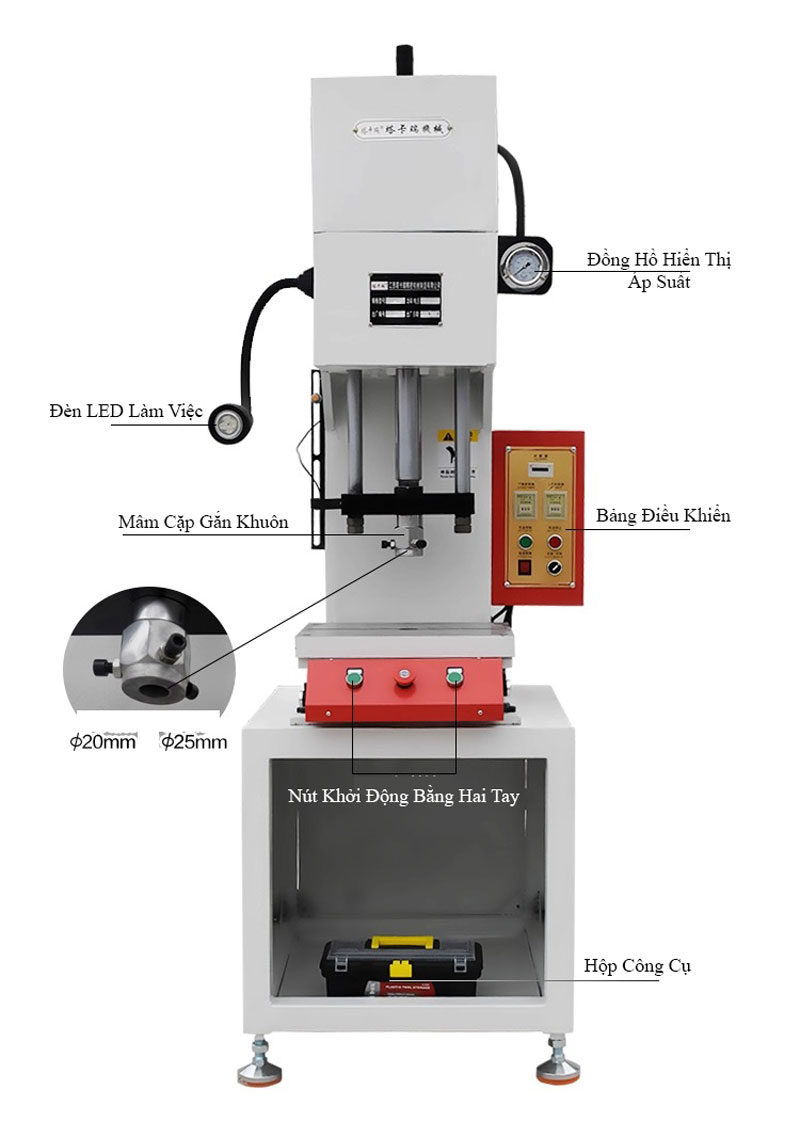 Khung máy được chế tạo theo dạng C-frame (khung chữ C), giúp thao tác dễ tiếp cận chi tiết cần ép, đồng thời mang lại độ mở rộng rãi để đặt các chi tiết kích thước lớn hoặc có hình dạng phức tạp. Khung thép được gia công dày, chắc chắn, chịu lực tốt, hạn chế biến dạng và đảm bảo độ ổn định cao trong suốt quá trình ép.