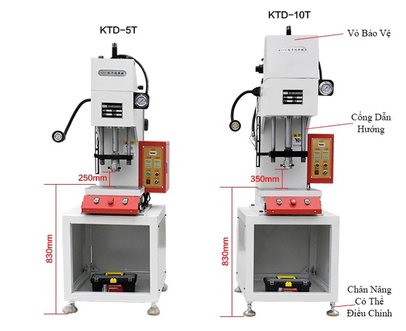Bàn ép có thể điều chỉnh độ cao tùy theo kích thước vật cần thao tác, giúp máy linh hoạt hơn trong nhiều dạng công việc. Một số phiên bản còn trang bị đế cao su chống trượt, lò xo hồi về giúp pít-tông trở lại vị trí nhanh chóng sau mỗi lần ép, rút ngắn thời gian thao tác.