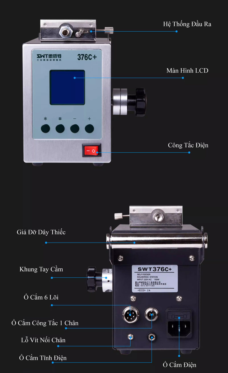 Hệ thống cấp thiếc tự động được điều khiển chính xác, cho phép điều chỉnh tốc độ và lượng thiếc cấp linh hoạt theo từng ứng dụng. Người dùng có thể vận hành bằng nút bấm tay cầm hoặc bàn đạp chân, thuận tiện cho thao tác liên tục trong môi trường sản xuất.